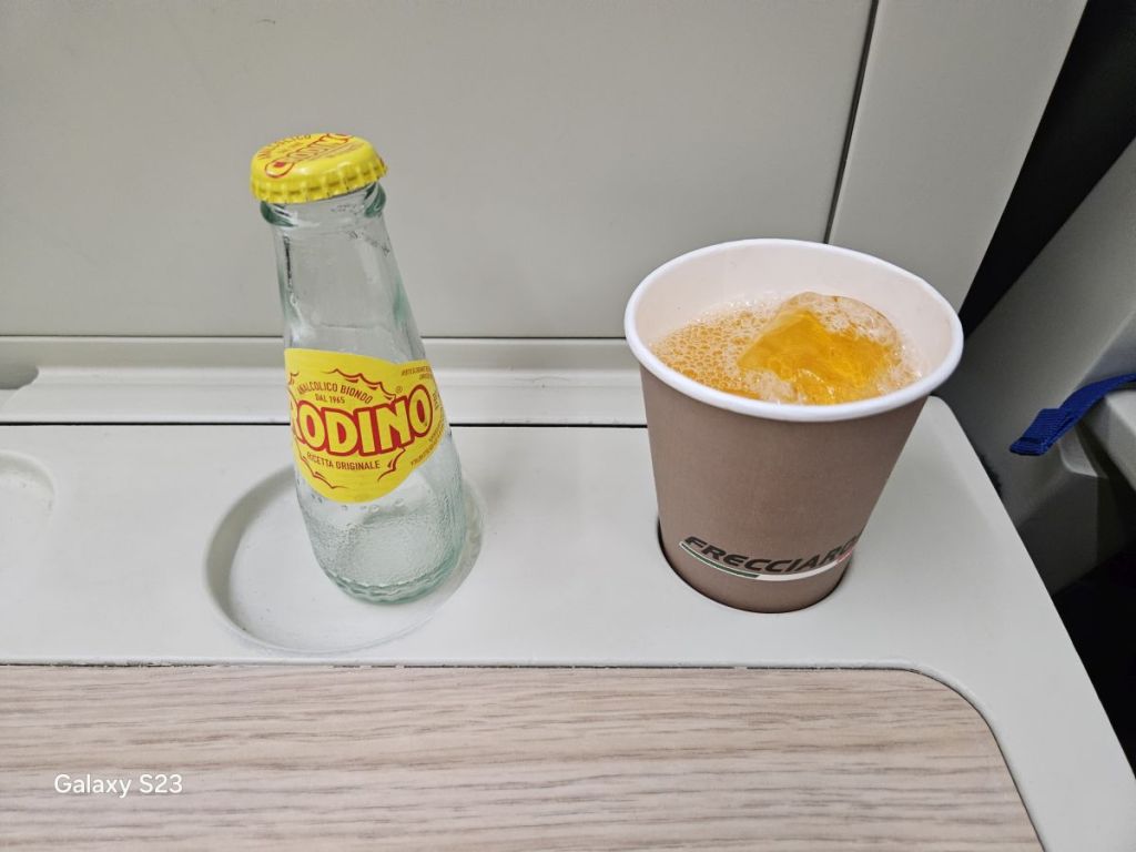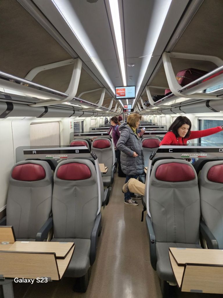 Kto by čakal, že vlak bude málo obsadený vzhľadom na cenu, prípadne, že v ňom budú hlavne turisti, ten by sa šeredne zmýlil. Vlak bol plný do posledného miestočka, väčšinou miestnymi. Taliani cestovanie rýchlovlakmi skrátka milujú.