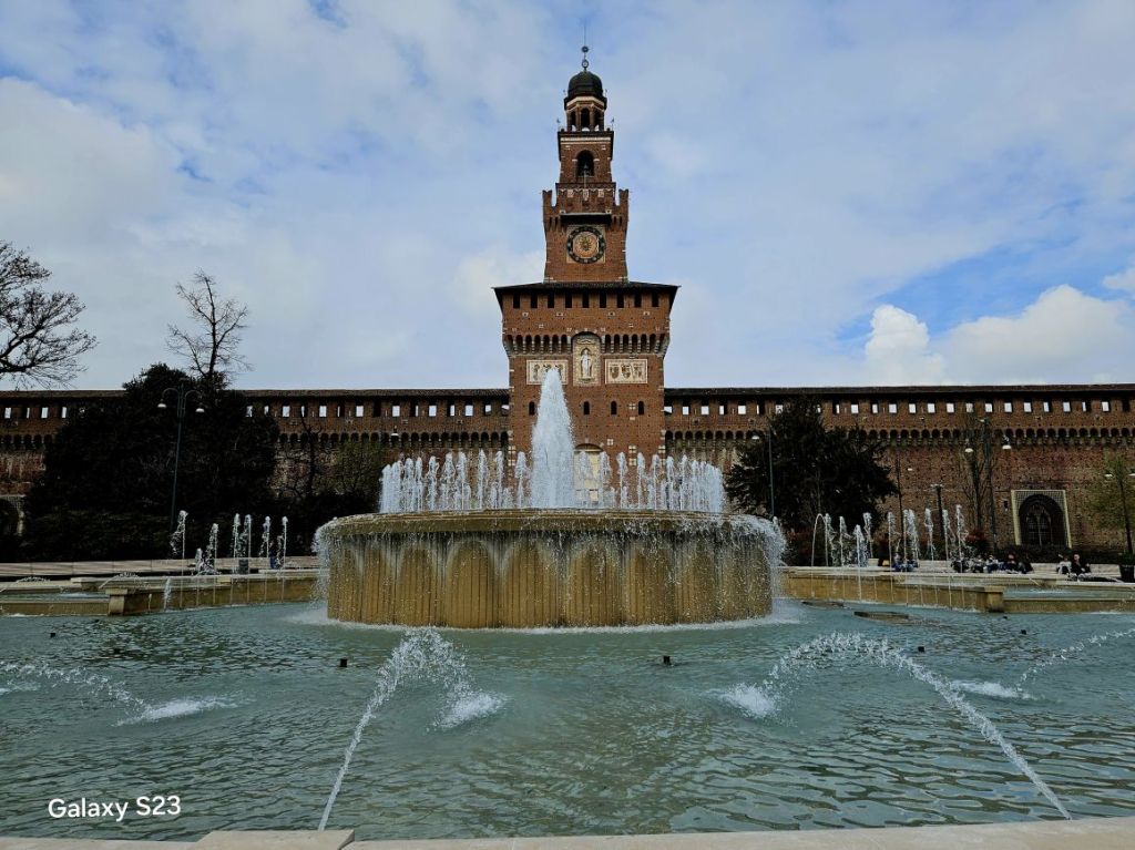 No a čo by to bolo za mesto, kedy nemalo vlastný hrad. Ten Milánsky sa volá Castello Sforzesco (Sforzeovský hrad) a bol postavený v 15. storočí. Hrad mal priekopy a bastióny – vidno ich dodnes, pôsobí však skôr ako pevnosť, než romantický zámok. A ešte jedno: Nádhernú fontánu má pred vchodom: