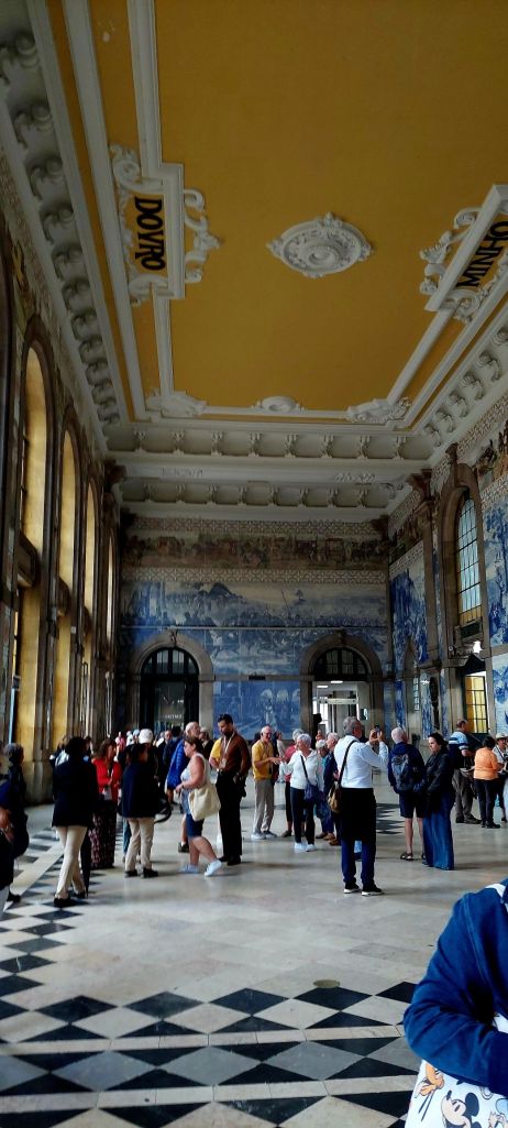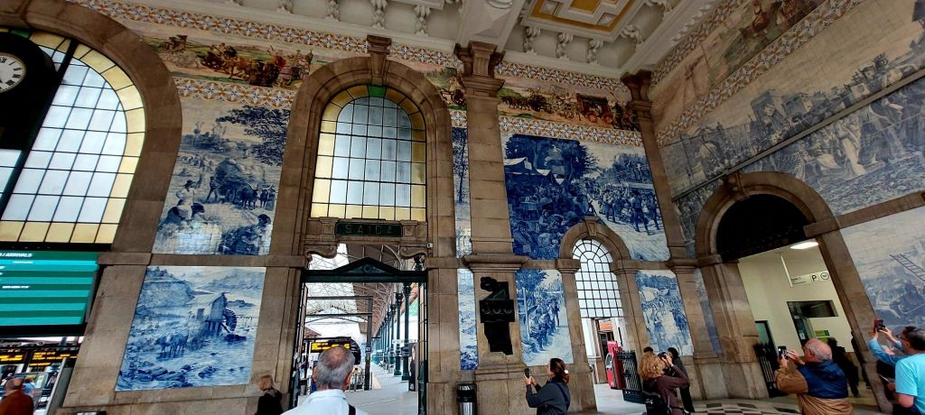 Čo sú to azulejos? Azulejo je obvykle štvorcová, jednostranne glazovaná keramická kachlička s farebnou výzdobou – najčastejšie jednofarebnou. Z väčšieho počtu azulejos sa skladajú nádherné nástenné obrazy. Slovo azulejo je arabského pôvodu a znamená aj všeobecne “modrastý”. Nie, nie je to špecialitou Porta, či Portugalska (takáto výzdoba sa bežne nachádza napríklaf i v Španielsku), čo je, ale asi svetový unikát je vďaka azulejos jedna z najkrajších železničných staníc v Európe. Volá sa Sao Bento a vyzerá takto: