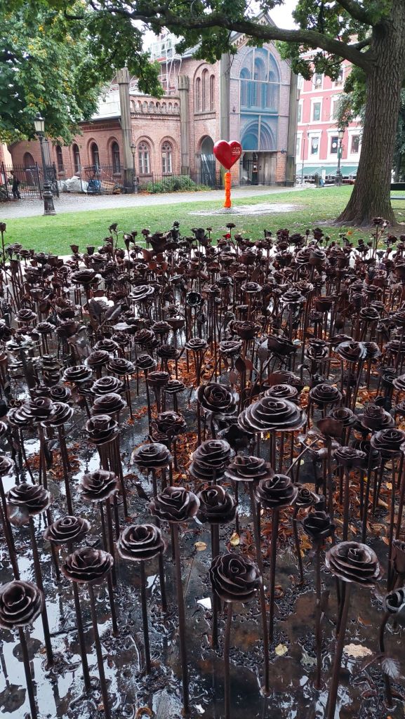 Cestu sme začali pri Oslo Domkirke kde v roku 2012 Anders Breivik nastražil bombu a až potom so svojou zbraňou odišiel na ostrov Utoya, kde bohužiaľ pokračoval vo svojom masakre. Celkovo tak pozabíjal 77 ľudí. No a pred týmto kostolom je práve toľkoto ruží. Za každú obeť jedna.. Pri neskoršom vyšetrovaní vyšlo najavo, že nastraženou bombou pri Domkirke chcel iba odlákať pozornosť a celý čas sa pripravoval na zabíjanie na ostrove Utoya.