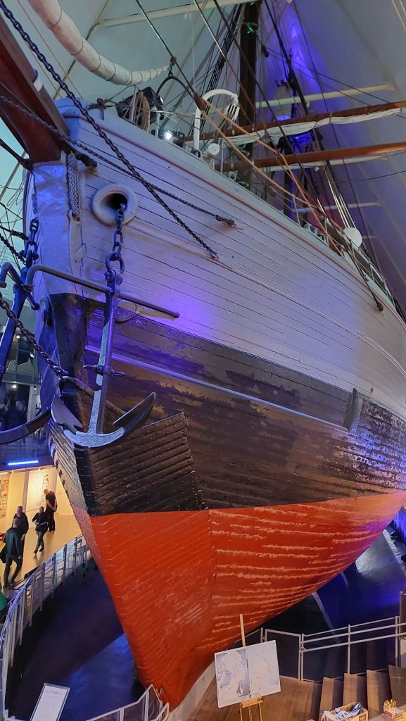 Neviem, či čitateľ bude vedieť, loď Fram bola tá loď, s ktorou plával Roald Amunsen v rokoch 1910-1912 na južný pól, ktorý potom dobyl a názov Fram je ako budovateľské heslo, znamená Vpred! Bola to už tretia polárna plavba lodi, keď sa vydal Amunsen dobyť južný pól. Múzeum je vlastne loď, kde si vyjdete na palubu, potočíte troška kormidlom, a hor sa do podpalubia. Tu sa nachádzajú zväčša autentické veci z expedície, kajuty, uvidíte ako námorníci žili, kde sa zabávali, kde jedli.. musím povedať, že to bolo zaujímavé. V múzeu sa ešte nachádza miestnosť, ktorá simuluje chlad na južnom póle.. to aby návštevníci vedeli a na vlastné telo cítili. Bola však pokazená a tak bol náš vstup o túto atrakciu ochudobnený.